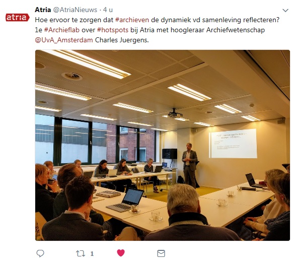 Tweet van Atria over de eerste bijeenkomst van het archieflab hotspots: