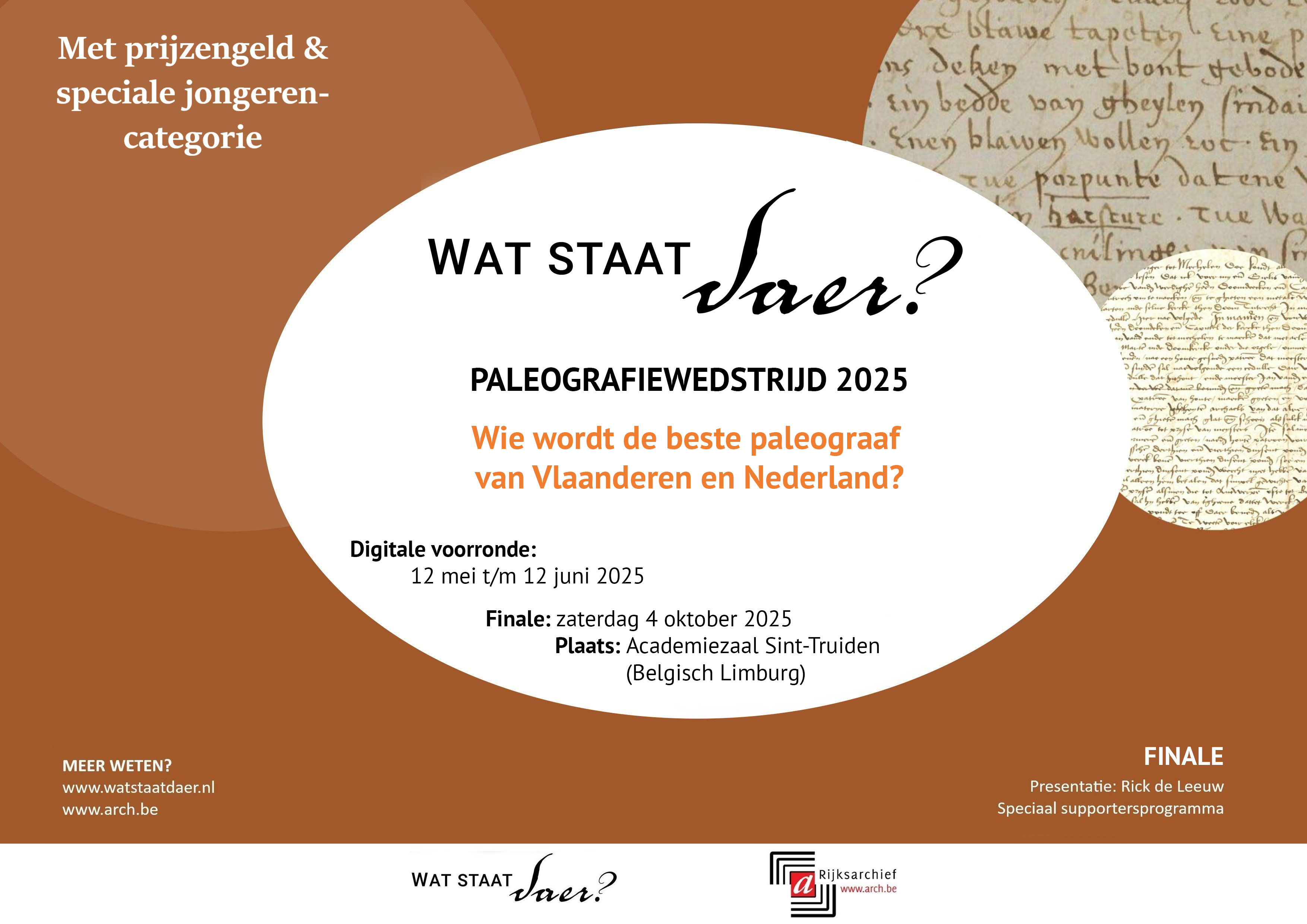 De ‘Wat staat daer? Paleografiewedstrijd 2025’ is een project van de deelnemers aan Wat staat daer? en de Vlaamse Rijksarchieven, waaraan de volgende instellingen meewerken: